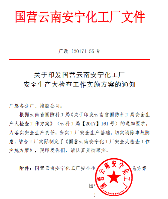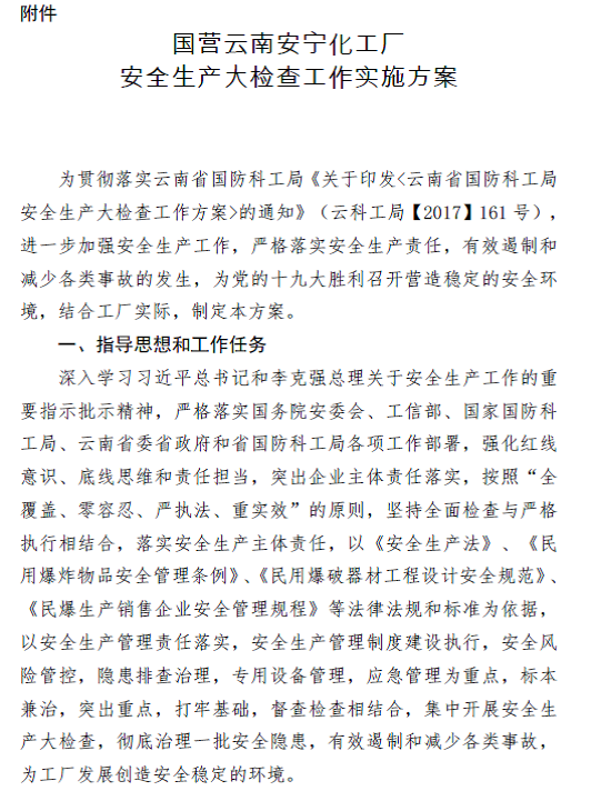 為認(rèn)真貫徹落實(shí)《國(guó)務(wù)院安全生產(chǎn)委員會(huì)關(guān)于開展全國(guó)安全生產(chǎn)大檢查的通知》(安委明電〔2017〕3 號(hào))、云南省安全生產(chǎn)委員會(huì)《云南省安全生產(chǎn)委員會(huì)辦公室關(guān)于印發(fā)云南省安全生產(chǎn)大檢查工作督查方案的通知》(云安辦[2017]45 號(hào))、云南省國(guó)防科工局《關(guān)于印發(fā)<云南省國(guó)防科工局安全生產(chǎn)大檢查工作方案>的通知》(云科工局[2017]161 號(hào))文件,工廠從學(xué)習(xí)動(dòng)員、制定方案、自查自糾、整改落實(shí)等環(huán)節(jié)扎實(shí)開展工作,為黨的十九大勝利召開營(yíng)造穩(wěn)定的安全環(huán)境。